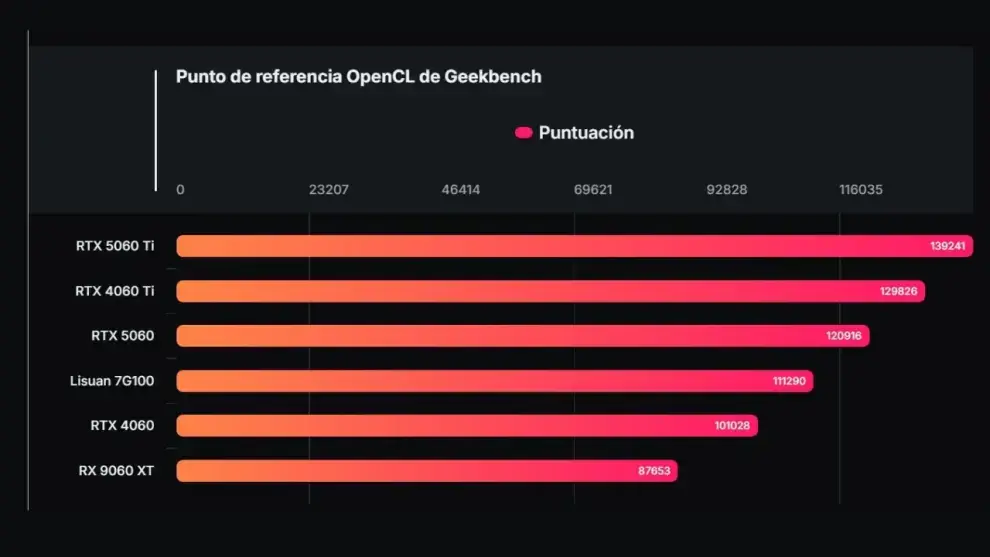 La Lisuan G100 está fabricada con un proceso de 6 nanómetros y cuenta con 12 GB de memoria GDDR6, interfaz PCIe 4.0, 192 unidades TMU y 96 ROP, con un consumo aproximado de 225 vatios. En pruebas OpenCL filtradas, el modelo alcanzó alrededor de 111.290 puntos, superando los resultados de la RTX 4060 y situándose cerca de tarjetas más recientes de la misma gama.